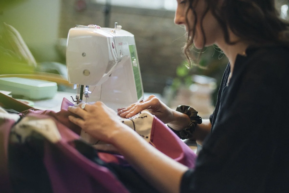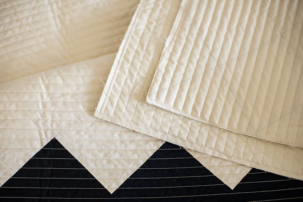 After the quilting process is complete, the quilt is carefully 'squared' up, cut to its desired shape, and the the binding is sewn on. At ESBE, we take pride in finishing the binding by hand, opting for our last sign off on every piece to be one of thoughtful touch.